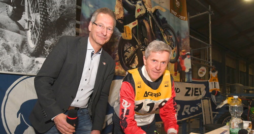 Am Vorabend der diesjährigen Dahlener Geländefahrt hatte sich der Gastgeber-Verein zusammen mit dem Torgauer Ronald Preuß und dessen Helfer, passend zum runden Geburtstag, einen schönen Blick in die Historie einfallen lassen. In der Werkhalle der Firma Abbundzentrum Dahlen hatte man eine schöne Veranstaltung mit dem Themenschwerpunkt Harald Sturm und seine Erfolge organisiert. Bei dieser zitierte Ronald Preuß etliche Passagen aus dem 2017 erschienenen aber längst vergriffenen Buch „Ein Leben auf zwei Rädern – Die MZ-Legende Harald Sturm“ und der Stargast gab dazu so manche Episode ergänzend preis. Schon ober der rund 500 wegen ihm anwesenden Fans war „Harry“ ziemlich überrascht. Geradezu überwältigt war er, als der Dahlener Bürgermeister Matthias Löwe ihn um einen Eintrag ins Goldene Buch der Stadt bat. Garniert war die Geschichtskunde mit einer absolut sehenswerten Ausstellung mit 23 echten Raritäten als Enduro-Technik-Zeitzeugen (11 MZ und 12 Simson) aus den 1960er-, 1970er- und 1980er-Jahren. Die meisten waren Ex-Werks-Geländemaschinen und ließen die Herzen schon am Nachmittag ebenso höher schlagen, als der unterhaltsame Abend mit Harald Sturm.