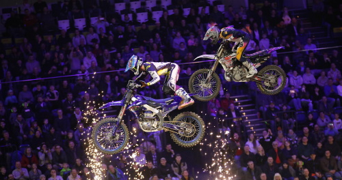 kombiniert Sprünge über FMX-Rampen mit packenden Parallelrennen. Zwei Fahrer treten im