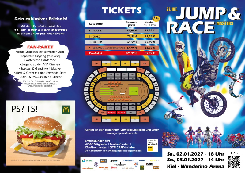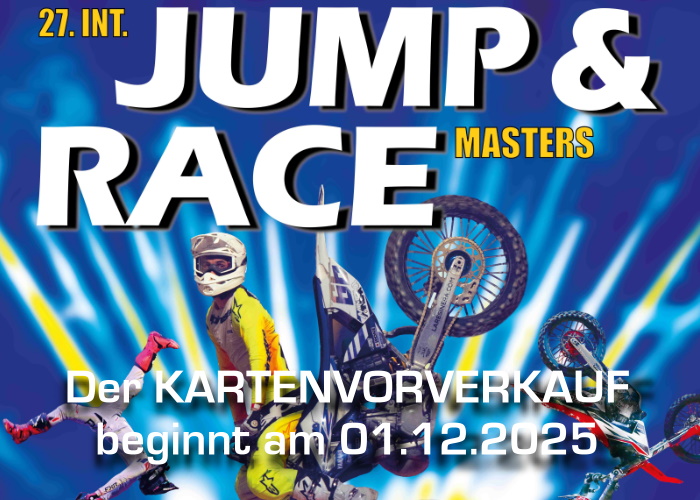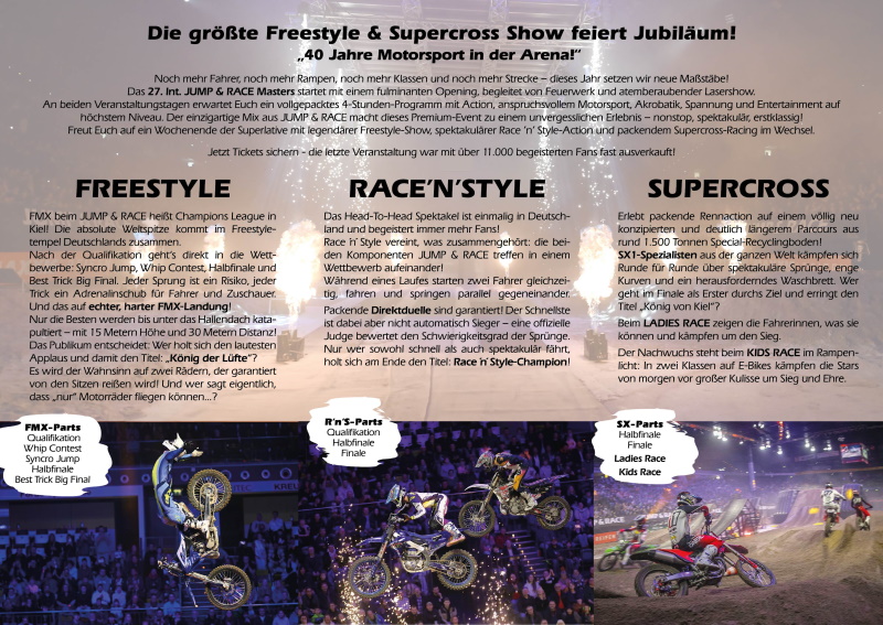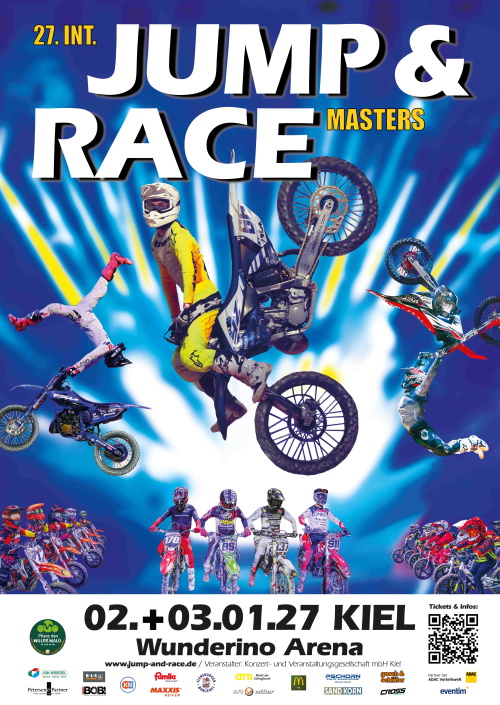 Die größte Motorsportshow im Norden feiert Jubiläum: "40 Jahre Motorsport in der Arena". Aus dem 1. Hallen-Moto-Cross von 1987 ist in 4 Jahrzehnten eine gigantische Großveranstaltung geworden. Zum Jahresauftakt 2027 präsentiert die Wunderino Arena die spektakulärste Ausgabe der JUMP & RACE Show, die es je gegeben hat. Mit mehr Fahrern, mehr Rampen, mehr Klassen, einer komplett neu designten Strecke und etlichen Jubiläumsüberraschungen wird das Event zu einem unvergleichlichen Action-Erlebnis für alle Motorsport- und Freestyle-Fans.