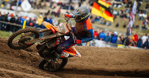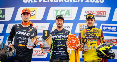 Perfekter Auftakt: Max Nagl (D/Dörr Motorsport Triumph Racing) setzt sich beim Saisonstart des ADAC MX Masters in Grevenbroich mit drei Laufsiegen an die Tabellenspitze. Der amtierenden Meister Roan van de Moosdijk (NL/KTM Kosak Racing Team) begann die Saison mit dem zweiten Veranstaltungsrang ebenfalls stark. Tom Koch (D/KTM Sarholz Racing Team) kehrte mit dem dritten Platz erfolgreich zurück in die Meisterschaft.