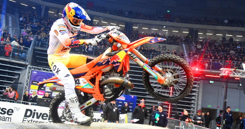 Die letzten fünf SuperEnduro-WM-Titel gewann Billy Bolt „en suite“ und machte beim Auftakt der neuen Saison an diesem Samstag im polnischen Gliwice (Gleiwitz) dort weiter, wo er im März dieses Jahres aufgehört hatte – auf der obersten Stufe des Podests. Nachdem der 28-jährige Brite erneut die Superpole für sich entschieden hatte, gewann er auch den ersten sowie den dritten Heat über sechs Minuten plus einer Runde. Nur im mittleren Lauf musste er sich hinter seinem Landsmann Jonny Walker mit Platz zwei zufrieden geben, was seinem nächsten Grand-Prix-Sieg allerdings keinen Abbruch tat. Anschließend sagte er: „Ich bin glücklich, wie ich die drei Rennen gemanagt habe. Im zweiten Lauf bin ich gestürzt, was mein Fehler war, aber insgesamt bin ich mit dem heutigen Tag sehr zufrieden. Nun freue ich mich auf Riesa.“