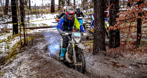 Der zweite von insgesamt drei Läufen des ROCK Oil Enduro Wintercup führte das Fahrerfeld nach Reetz – und einmal mehr spielte das Wetter eine entscheidende Rolle. Nach einsetzendem Tauwetter unter der Woche hatte erneuter Frost am Donnerstag und Freitag zahlreiche Wasserstellen wieder gefrieren lassen. In der Nacht vor dem Rennen setzte zusätzlich Regen ein, der die Strecke erneut antaute und stellenweise tief aufweichte. Bei rund acht Grad am Renntag entwickelte sich so eine anspruchsvolle Mischung aus rutschigem Untergrund, schmierigen Auffahrten, ausgefahrenen Spurrinnen und zunehmend kräftezehrenden Schlammfeldern. Die schwierigen Bedingungen sorgten bereits im Vorfeld für einige Absagen – und verlangten den verbliebenen Startern alles ab.