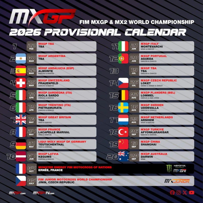The 2026 season will begin on 22 February with a yet-to-be-announced venue before heading to Argentina on 8 March, on a location to be announced soon for the now traditional South American round. Two weeks later, MXGP heads to Spain for the Doñana Xperience Almonte MXGP of Andalucia, taking place for the very first time in Almonte in the province of Huelva, in the heart of the Andalusian region on 22 March for the first European outing, followed directly by Switzerland in Frauenfeld on 29 March, the first back-to-back races of the year.